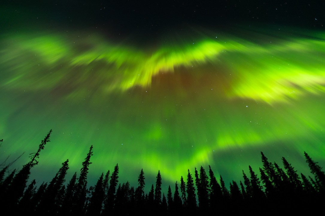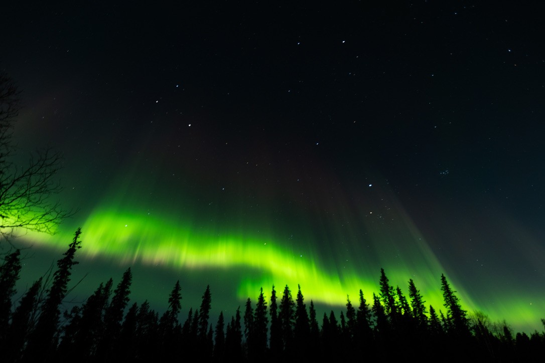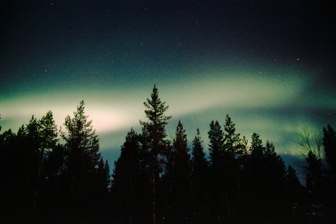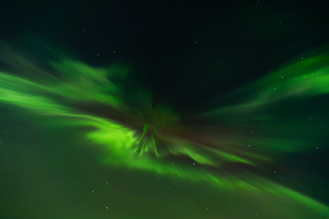 A long, wavy stream of green light was dancing behind the pines, gliding closer like a river in the sky. As we watched, the lights deepened in color, taking on reds and forming a kind of translucent veil—like silk in motion. At one point, the aurora wasn’t just on the horizon, it was above us. When I looked up, I saw something I can only compare to an exploding supernova.